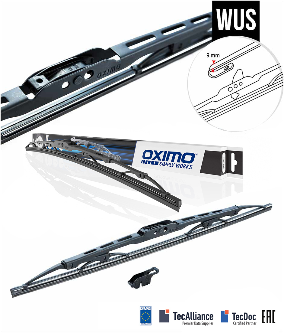 U-type wipers with frame construction, lengths 275 – 700 mm. It included U-Type 9 mm and U-Type 8 mm adapters, which enable mounting on a side spindle (older cars from the USA) and a rail with a screw (older Japanese cars). The metal parts are made of durable, high-carbon steel, completely galvanized, for long-term and effective protection against corrosion.